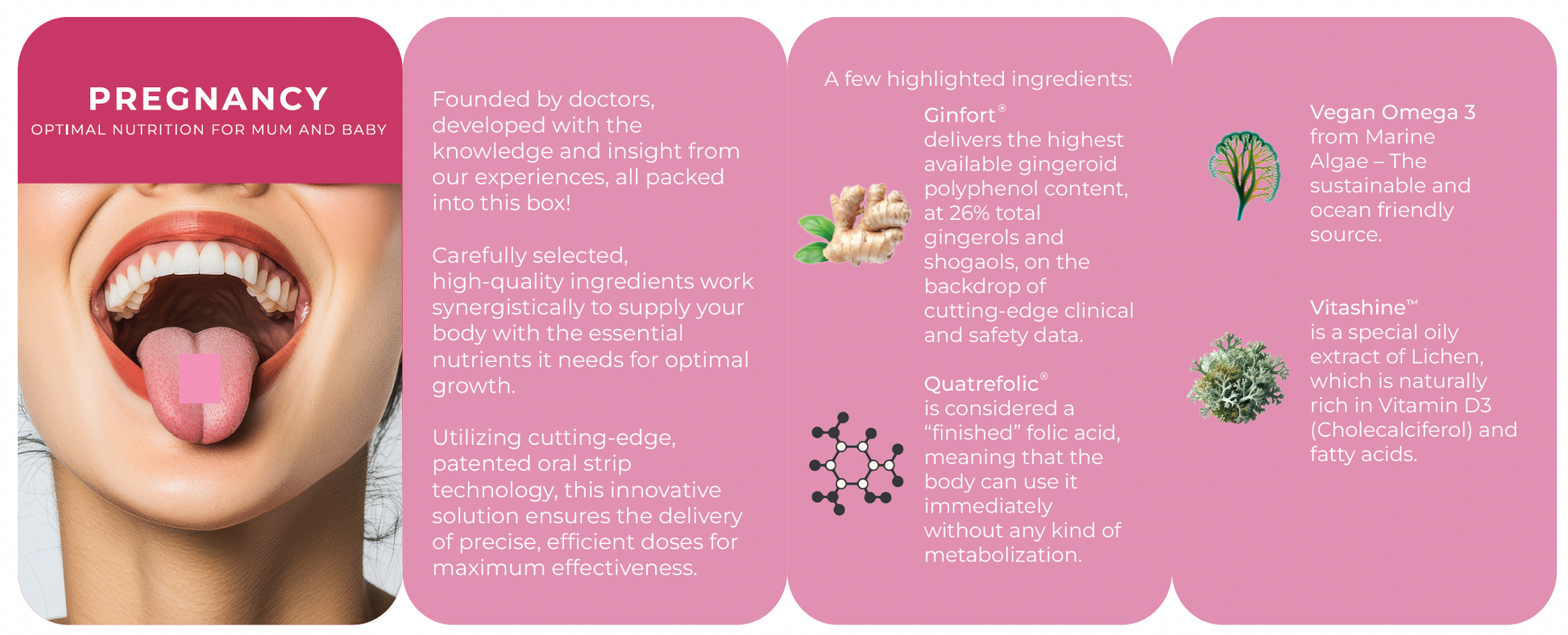 Combining German NanoEncapsulation technology with premium ingredients like Vegan Omega 3 and patented ingredients such as Quatrefolic® and Ginfort®, we can pack it all into one simple oral strip. A vitmain strip that melts in your mouth and tastes great!
