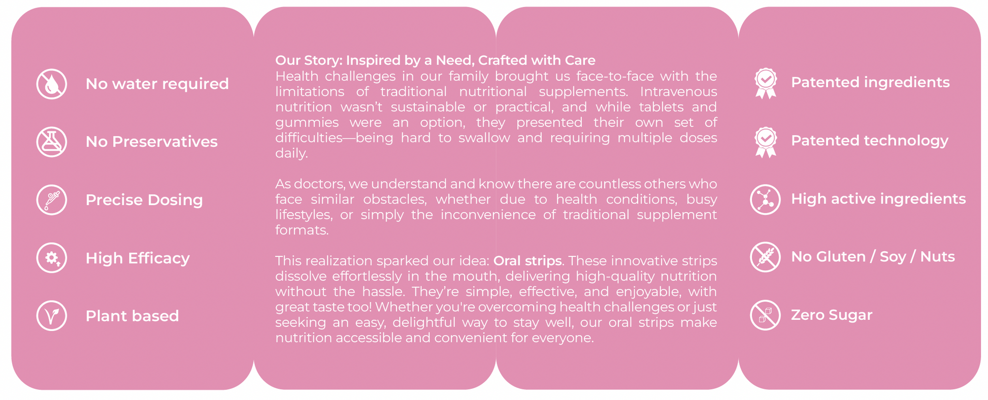 Our unique pregnancy oral strips formulated by doctors play a crucial role in complementing your nutritional needs throughout pregnancy. By taking just one strip a day, it provides you with the essential nutrients and minerals required throughout pregnancy.